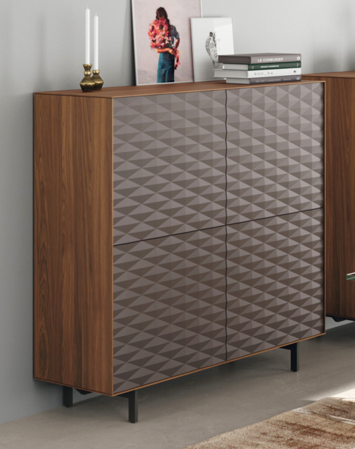 Aparador alto de diseño para salones y comedores con muebles de calidad. Aparador elaborado en DM para lacar y con chapas naturales de roble o nogal americano para acabados barnizados. Las terminaciones son con acrílicos que otorgan al mueble gran durabilidad y resistencia. Puertas provistas de bisagras con auto-freno y sistema de apertura mediante pulsador y cajones que incorporan guías metálicas de extracción parcial y cierre soft. Disponible con puertas y con cajones a elegir. Disponible con dos tipos de patas metálicas o con zócalo. Disponible en 2 medidas de altura.