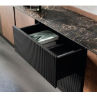 Combina puertas lisas con cajones de frente acanalado vertical, un recurso estético que aporta profundidad, textura y un toque distintivo sin renunciar a la sobriedad.