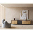 Mueble TV de estilo contemporáneo y líneas minimalistas, diseñado para salones que buscan muebles de televisión de alta calidad donde el diseño y la funcionalidad convivan en equilibrio. Su formato rectangular, limpio y proporcionado, aporta sensación de orden y armonía visual, integrándose con facilidad en espacios modernos y actuales, mientras la madera natural añade calidez y carácter al ambiente.