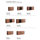 - Incorpora un sistema funcional con puertas con bisagras autofreno y un módulo central de tres cajones, ofreciendo espacios organizados y accesibles para almacenamiento y exhibición.