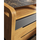 - Presenta una configuración de doble cajonera con frontales de madera y uñeros integrados, complementada por un tercer panel cajón con acabado alistonado que aporta una textura rítmica al conjunto.