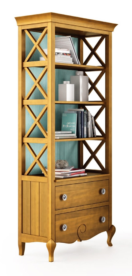 Librero de madera estilo vintage, con 2 cajones y costados con aspas y elaborado en madera de pino natural de origen sostenible y con acabados naturales al agua que son más respetuosos con el medioambiente. Cajones provistos de guías metálicas ocultas y con auto-freno. Incluye los tiradores metálicos. Medidas: 88x45x206 cm.