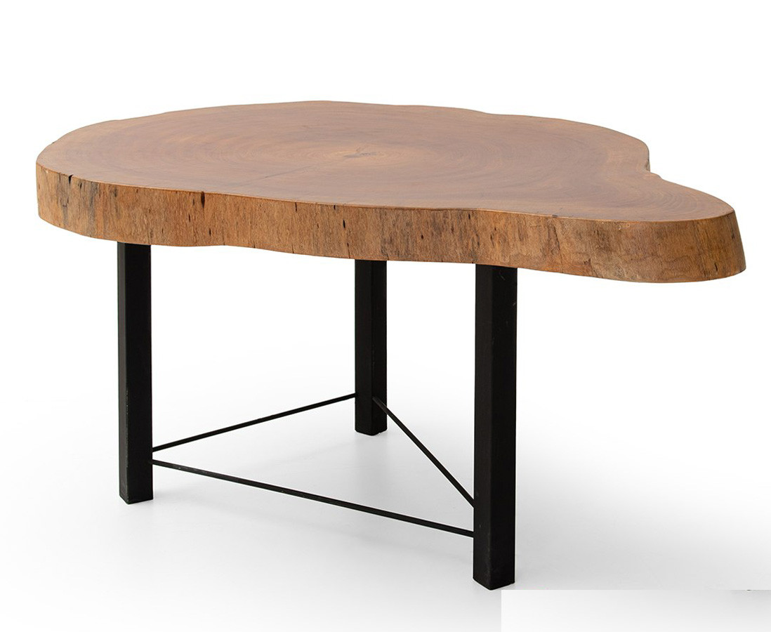 Mesa realizada con la tapa en forma de rodaja de tronco de madera maciza de Okume sin cantear y con base metálica con tres patas de hierro forjado. La madera de okume que se utiliza para la fabricación de estas mesas proviene de repoblaciones controladas lo que garantiza la conservación de los bosques y las especies que los habitan. El acabado final es con barnices sin tintes lo que proporciona el color natural de este tipo de madera que suele ser similar al de la foto. La madera que se utiliza lleva un largo proceso de secado antes de uso, pero al ser madera maciza, con el tiempo pueden aparecer grietas o hendiduras en la superficie debido a cambios de humedad o cambios de las condiciones climáticas. Estos cambios pueden causar que la madera se contraiga o se expanda, lo que puede generar tensiones en la estructura de la madera y causar la aparición de aberturas.