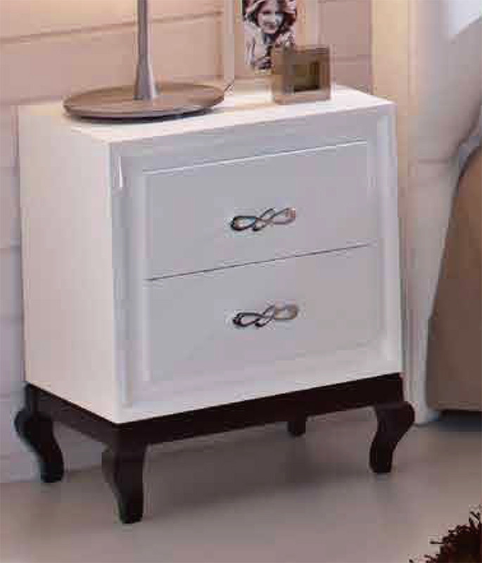 Mesilla de noche con 2 cajones, estilo clásica y pata isabelina. Mesita de noche realizada en madera de pino. Cajones provisto de guías metálicas con auto-freno. Medidas: 50x40x61 cm.