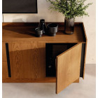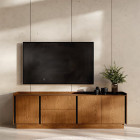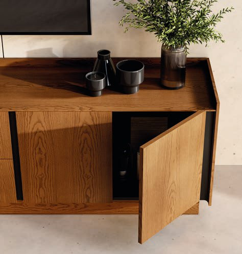 Mueble TV de diseño contemporáneo concebido para integrar en salones modernos donde estética y funcionalidad se integran con naturalidad. Sus líneas minimalistas y su formato bajo aportan orden visual, equilibrio y una sensación de amplitud muy valorada en espacios modernos, mientras la chapa de madera natural introduce calidez y personalidad.