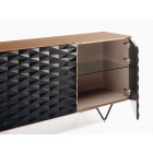 Mueble de tv bajo con opción de elegir puertas y cajones. Mesa de tv fabricada en DM para acabados lacados y con chapas naturales de roble o nogal americano de origen sostenible para acabados barnizados. Todas las terminaciones son al agua, lo que otorgan al mueble gran durabilidad y resistencia. Puertas provistas de bisagras con auto-freno y sistema de apertura mediante pulsador y cajones que incorporan guías metálicas de extracción parcial y cierre soft. Disponible con dos tipos de patas metálicas o con zócalo. Disponible en 3 medidas.