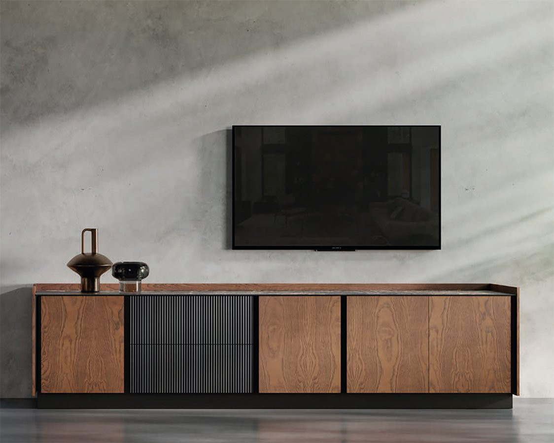 - Disponible en seis medidas estándar y opción a fabricación a medida, este mueble TV personalizable se adapta perfectamente a las necesidades de cada salón comedor.