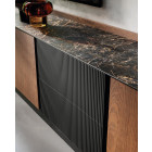 - Incorpora puertas lisas y cajones con frente acanalado vertical, un detalle distintivo que añade textura, sofisticación y valor decorativo.
