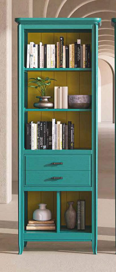 Mueble librero auxiliar de estilo colonial con 2 baldas y 2 cajones. Librería realizada en madera de pino de origen sostenible y disponible en variedad de acabados naturales al agua que son más respetuosos con el medioambiente. Los cajones incorporan guías metálicas ocultas y con auto-freno e incluyen los tiradores metálicos. Medidas: 74x39x202 cm.