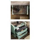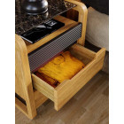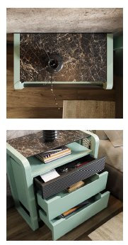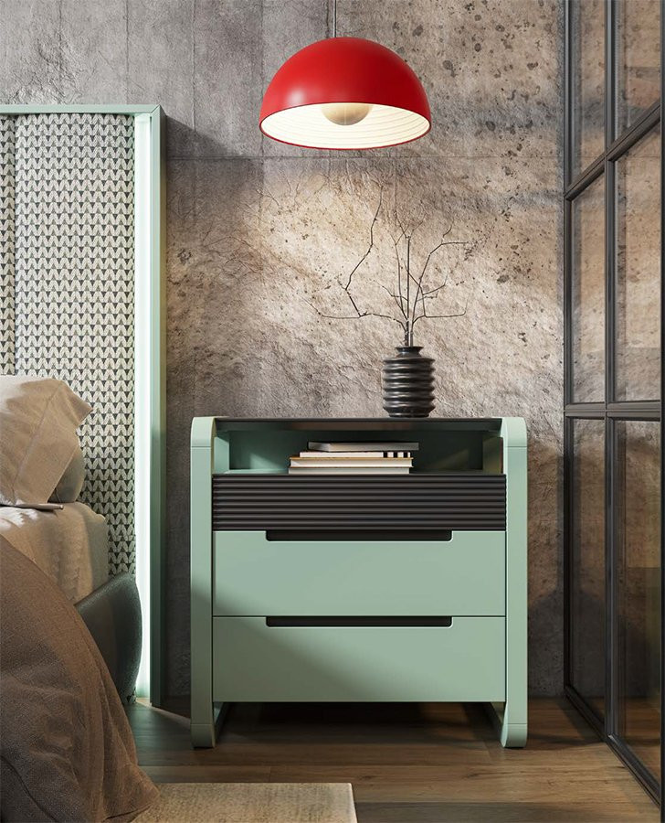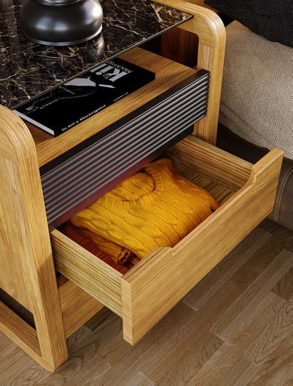 - Dispone de un estante superior abierto bajo una tapa, optimizando la funcionalidad para el almacenamiento de objetos de uso frecuente en el entorno del dormitorio principal.